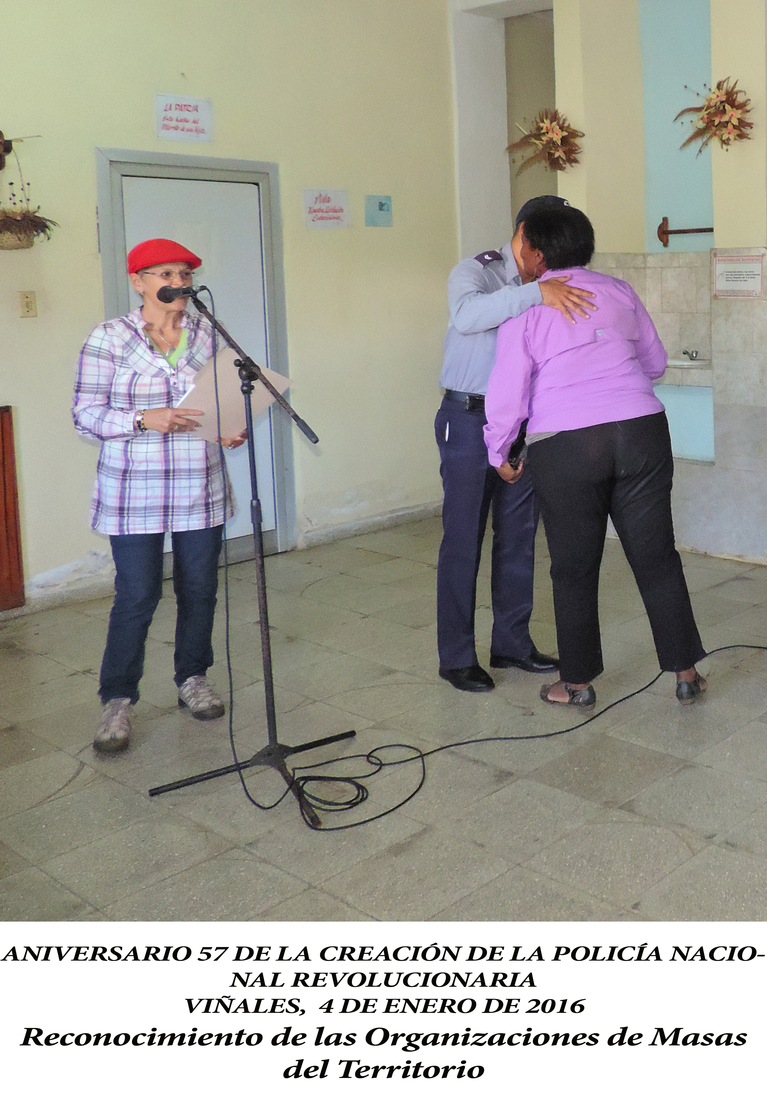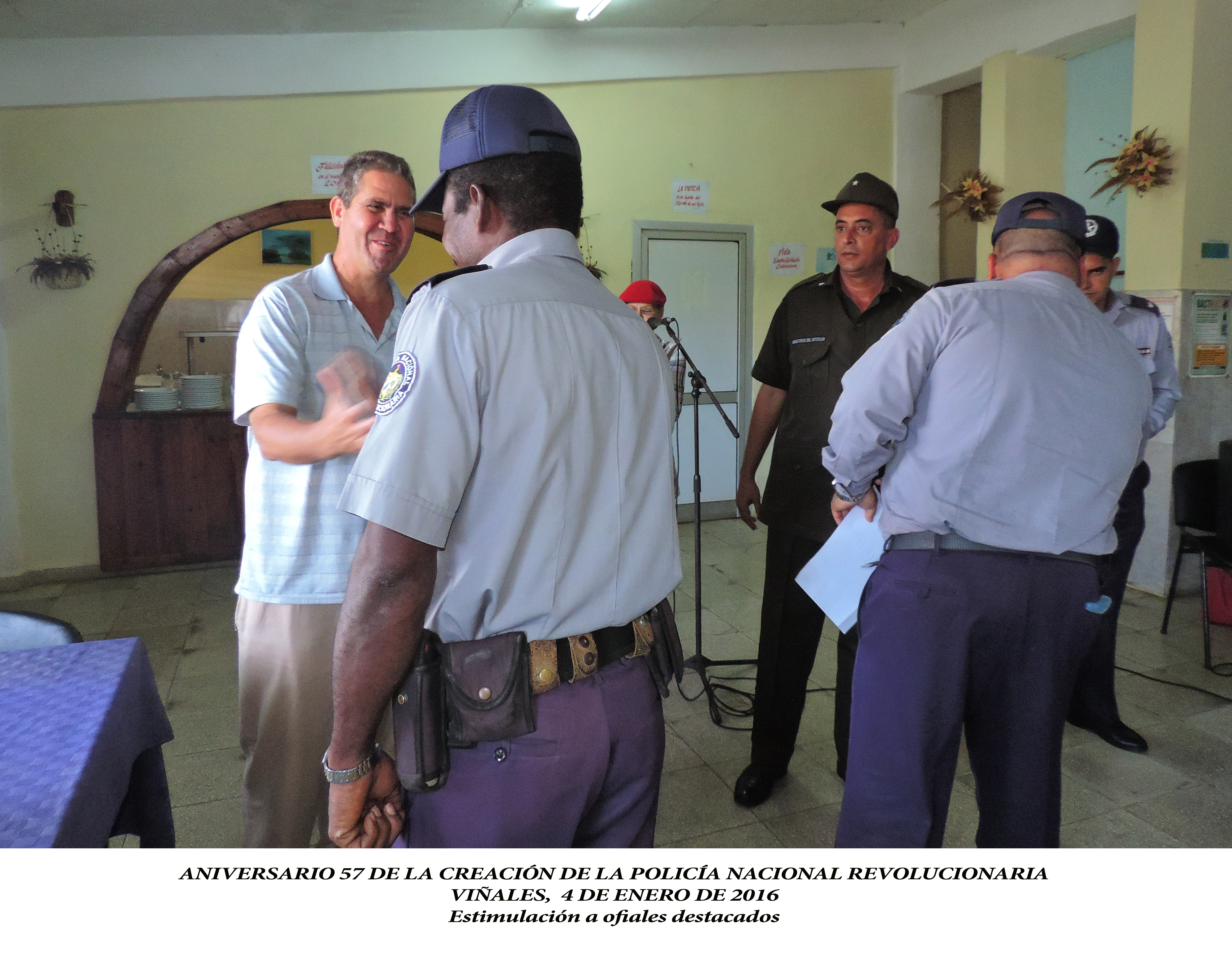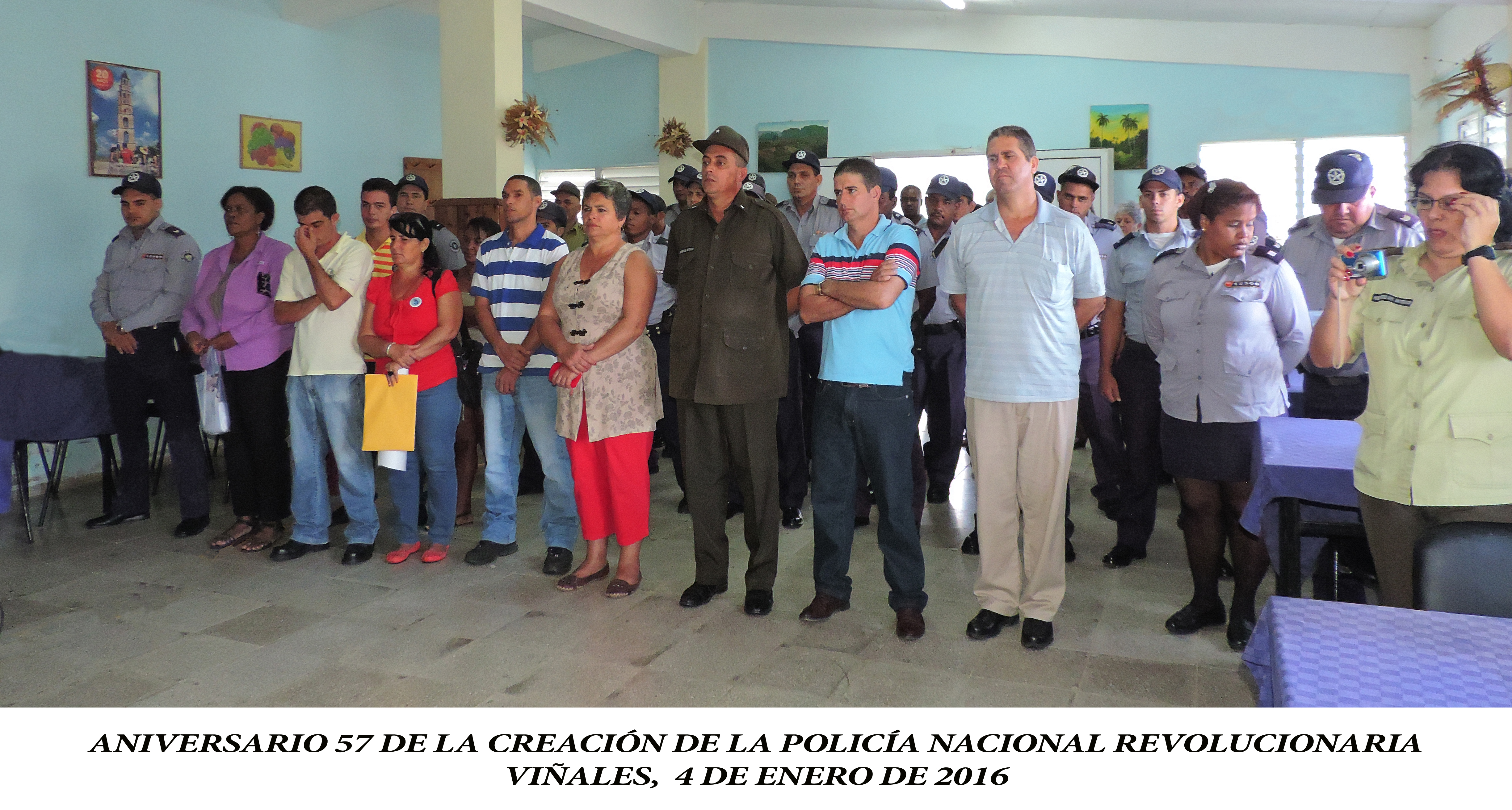 El Proyecto Sociocultural Comunitario “Ventana al Valle” contribuyó a la realización del Acto Municipal por el Aniversario 57 de la creación de la Policía Nacional Revolucionaria (PNR) en Viñales. En dicho acto conmemorativo, participaron Mandos de Dirección y oficiales de la PNR junto a las autoridades Administrativas y Políticas del territorio, así como representantes de las Organizaciones de Masas de la localidad. Este encuentro constituyó un acto de reafirmación y compromisos revolucionarios, compartiendo la alegría de este nuevo aniversario y el orgullo de tener hombres y mujeres que con inteligencia, disciplina y firmeza, junto al pueblo, salvaguardan las conquistas de nuestra Revolución. En el transcurso de la actividad fueron reconocidos el trabajo y el sacrificio de oficiales y agentes de nuestra Policía Nacional Revolucionaria. El grupo de danza “Arison” y el declamador Adrián Díaz Gallardo, amenizaron dicho encuentro con propuestas culturales