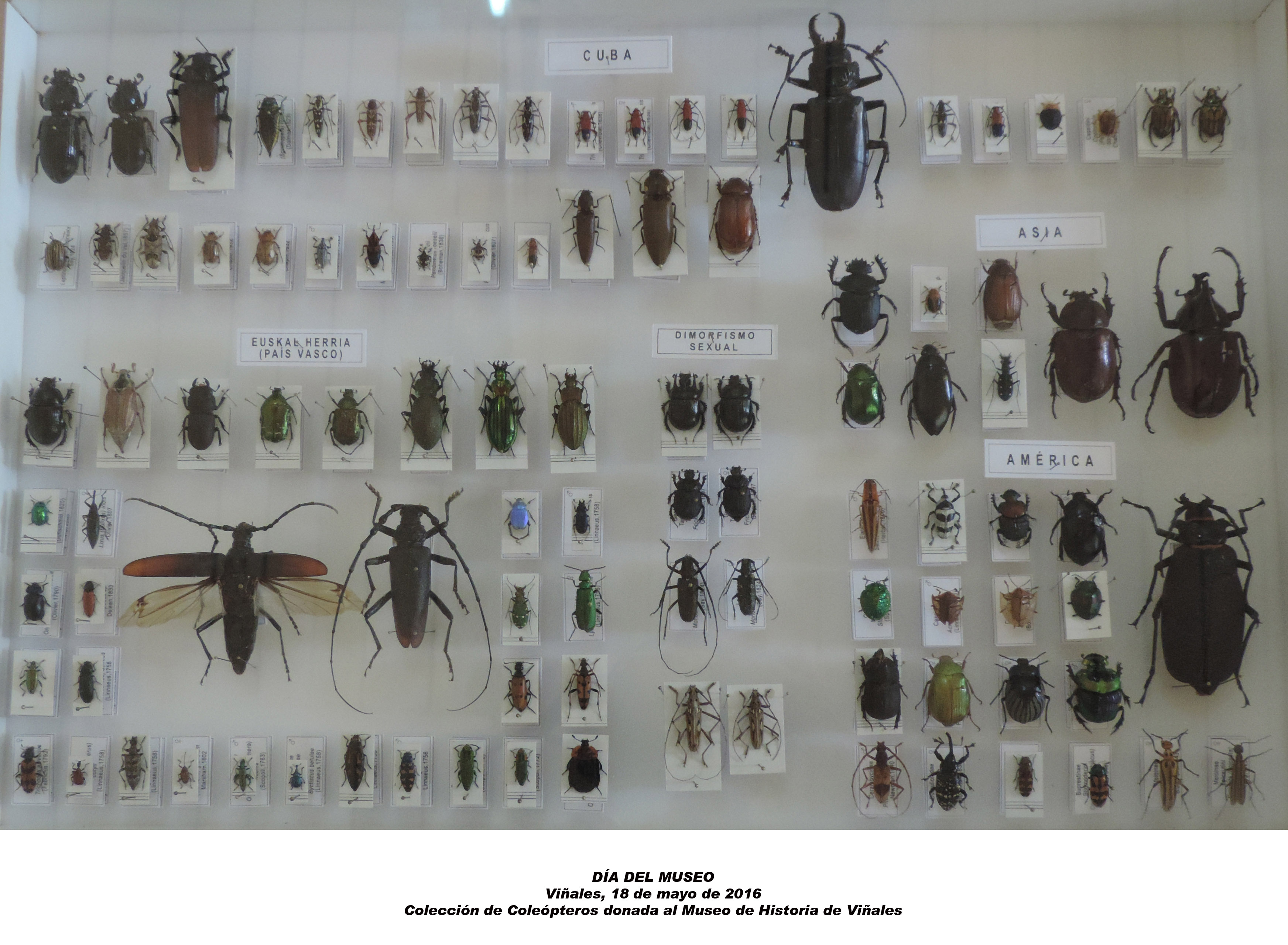 En la sede del Museo de Historia de Viñales se celebró ayer 18 de mayo el Día del Museo. Como parte de las actividades programadas para ese día se contempló la donación de una colección de coleópteros compuesta por 101 piezas por parte del entomólogo vasco Federico Zuazua Villa. Dicha colección enriqueció el patrimonio cultural viñalero ya que cuenta con varias muestras de coleópteros cubanos, así como de otras regiones del mundo